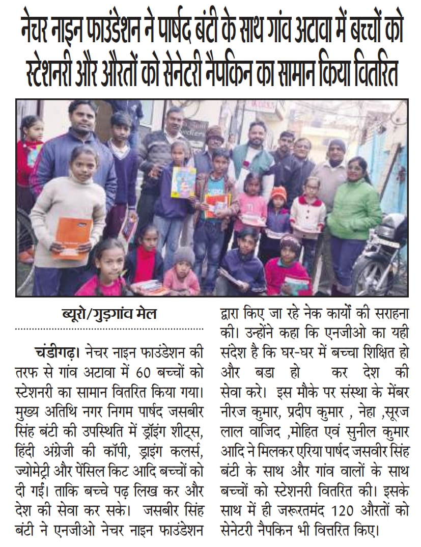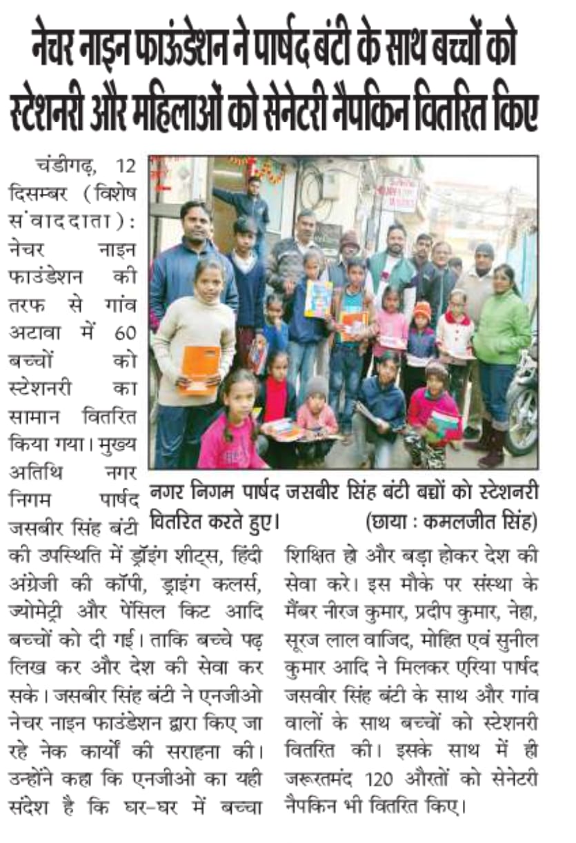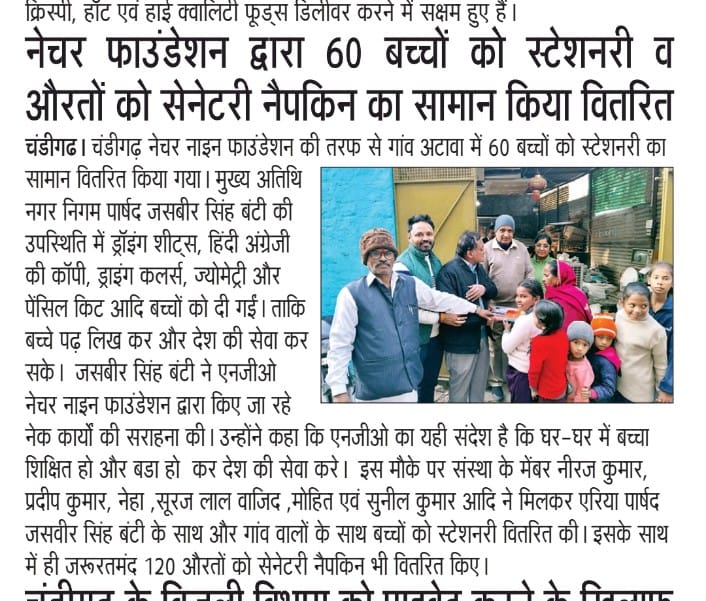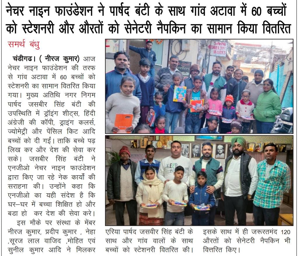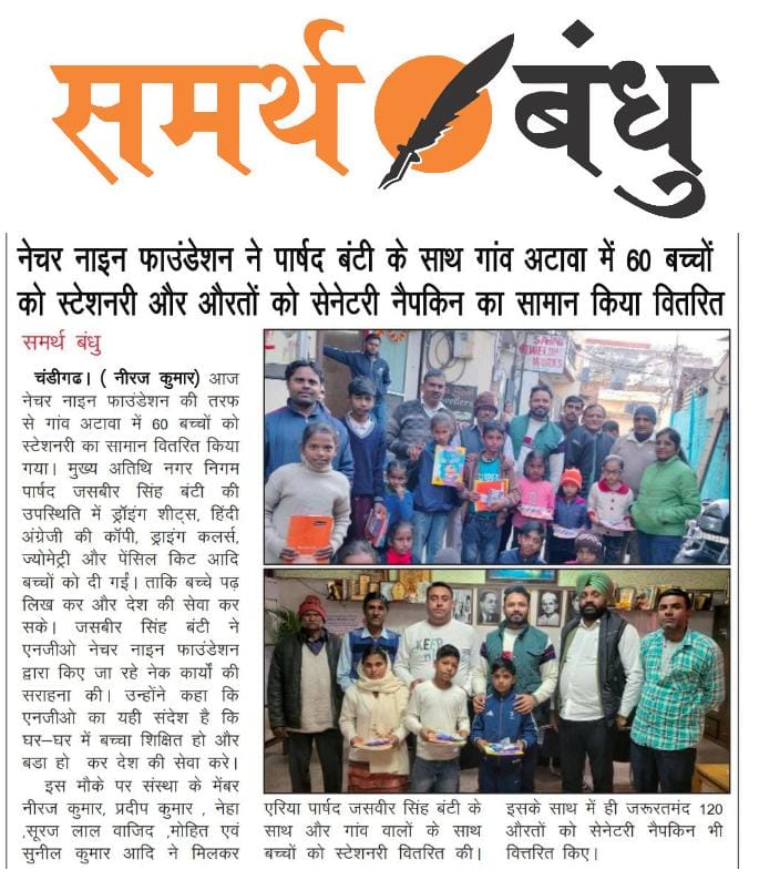 The Nature Nine Foundation organized a meaningful and impactful community outreach program in Village Attawa, Chandigarh, where essential stationery items were distributed to 60 school-going children. The initiative aimed to nurture young minds by providing them with the educational tools they need to learn, grow, and build a brighter future. This noble event was honored by the presence of Municipal Corporation Councillor Jasbeer Singh Banti, who has been a strong supporter of initiatives that promote education and uplift underserved communities, Supporting Education Through Essential Supplies During the event, children received a wide range of educational materials, including: